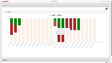 ラック利用率、電源使用状況(定格、実測)を集計したグラフで表示します。 利用状況により、顧客配置、電源設備やサーバールームの拡張などの計画に使用することができます。 |